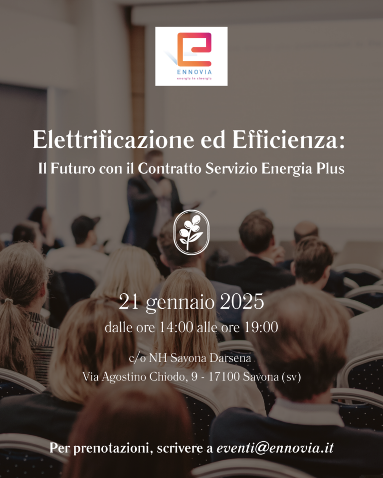 Il 21 gennaio 2025, a Savona, la nostra CEO ing. Angelica Agosta presenterà l’evento “Elettrificazione ed efficienza: il Futuro con il Contratto Servizio Energia Plus”, incontro di approfondimento dedicato ai temi dell’efficienza energetica e al modello innovativo del contratto Servizio Energia Plus.